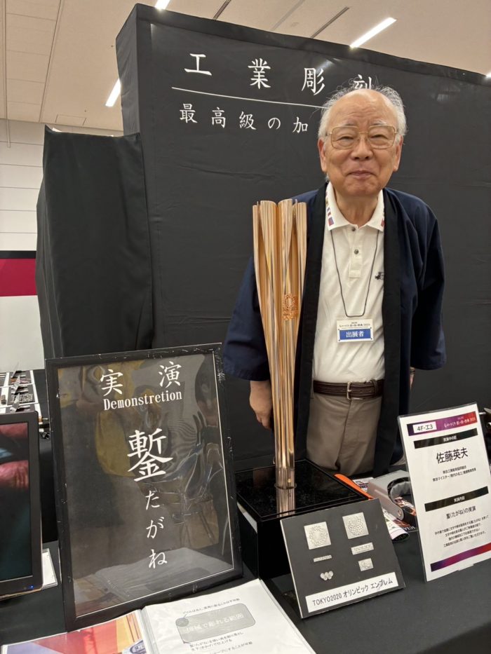 東京2020オリンピック・パラリンピックの聖火リレートーチのエンブレムの金型作成を担当された、佐藤英夫氏にお会いすることもできました。エンブレムが決まった時に、その角の多さに「大変だ」と思われたそうです(単純に掘ると角は丸くなるため)。