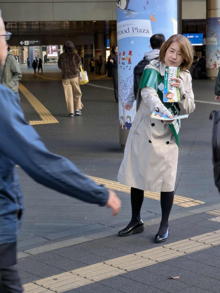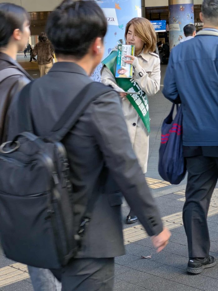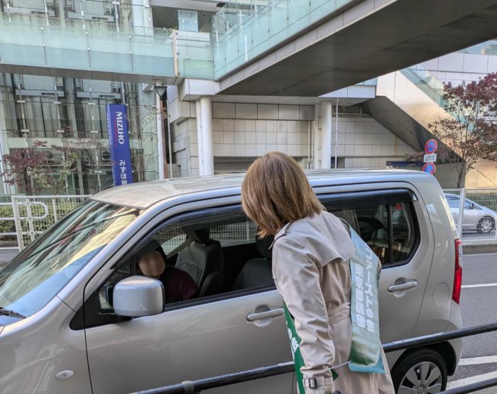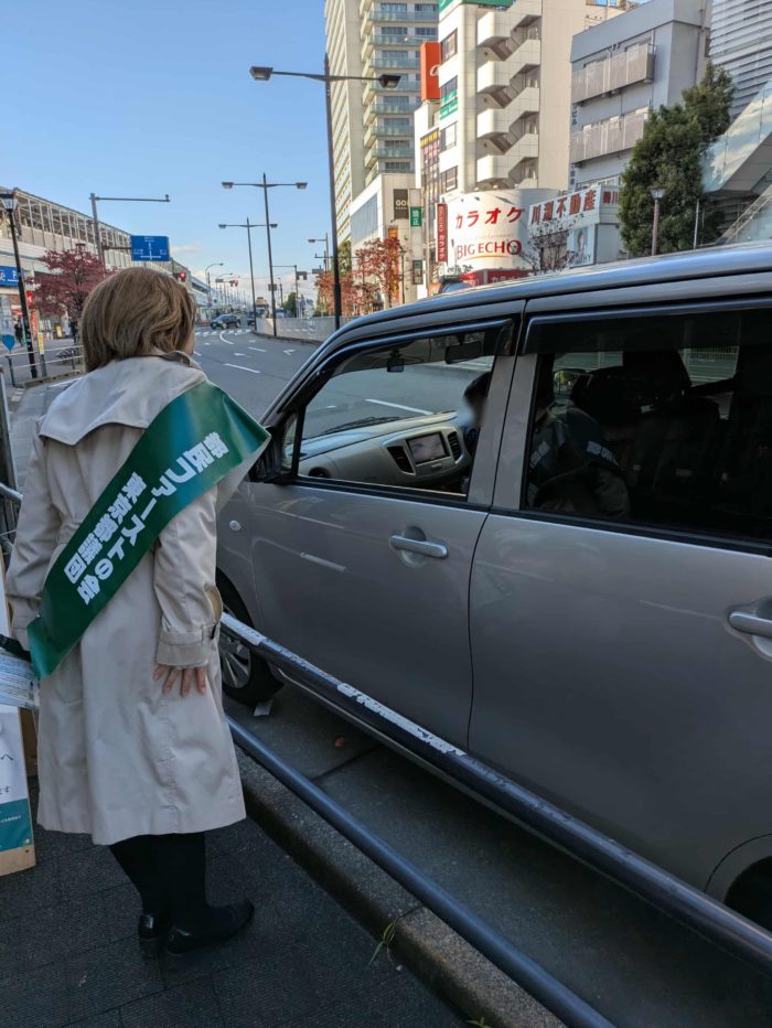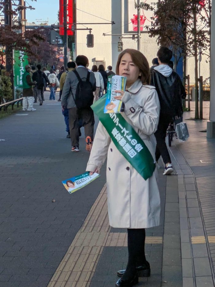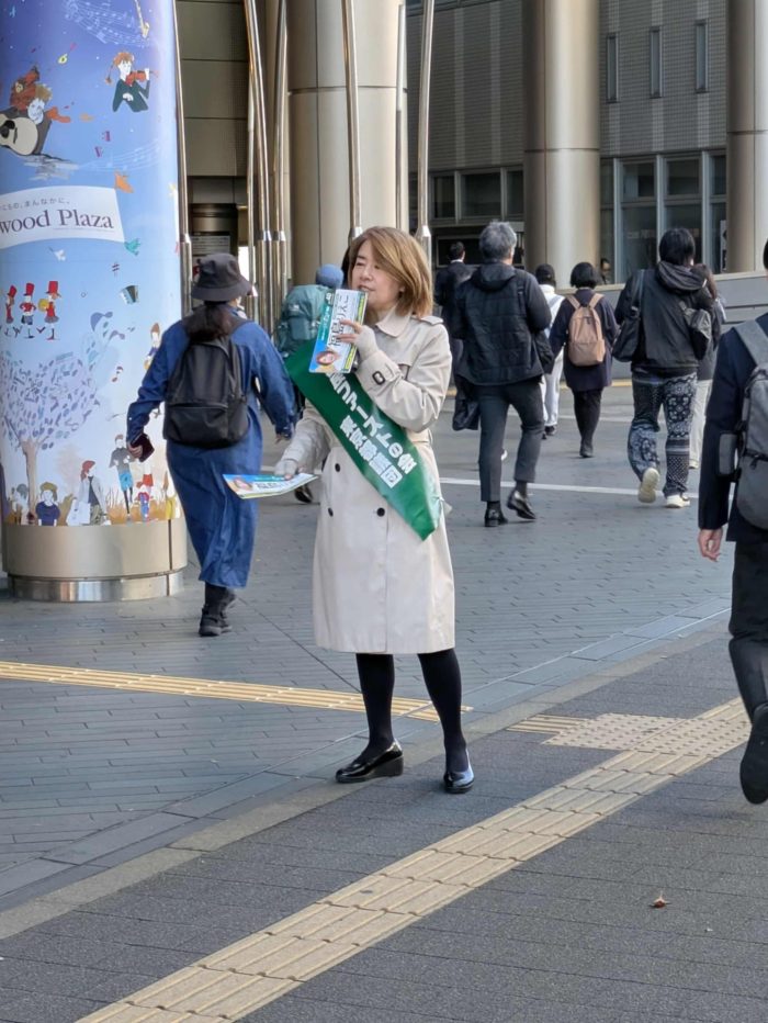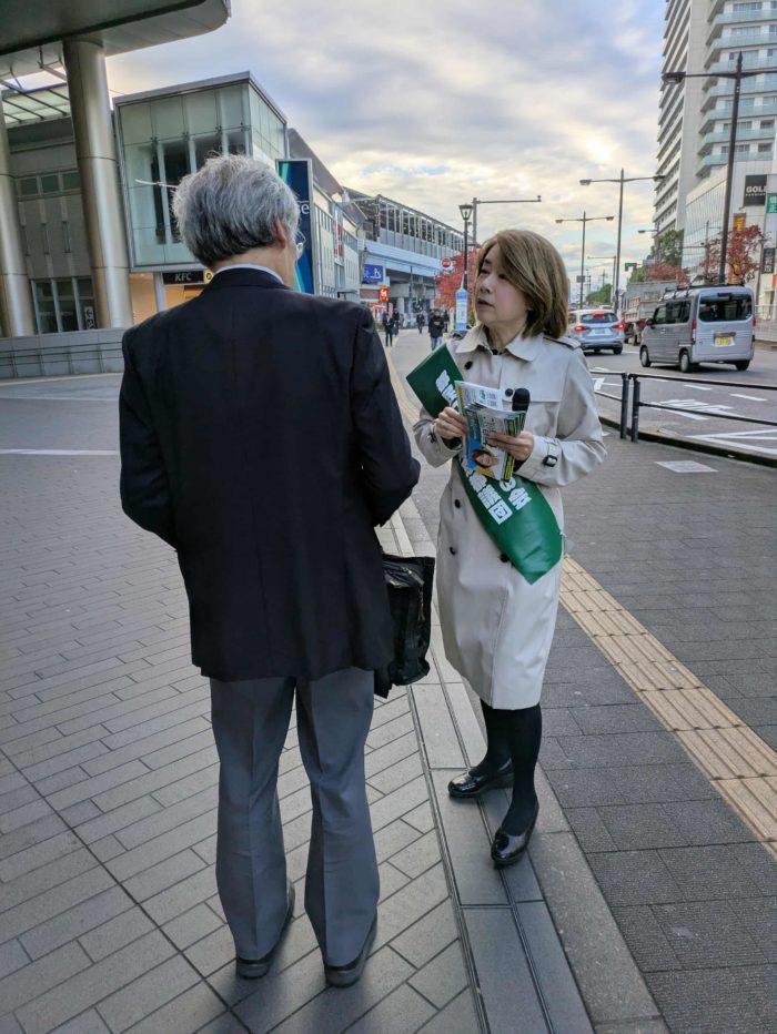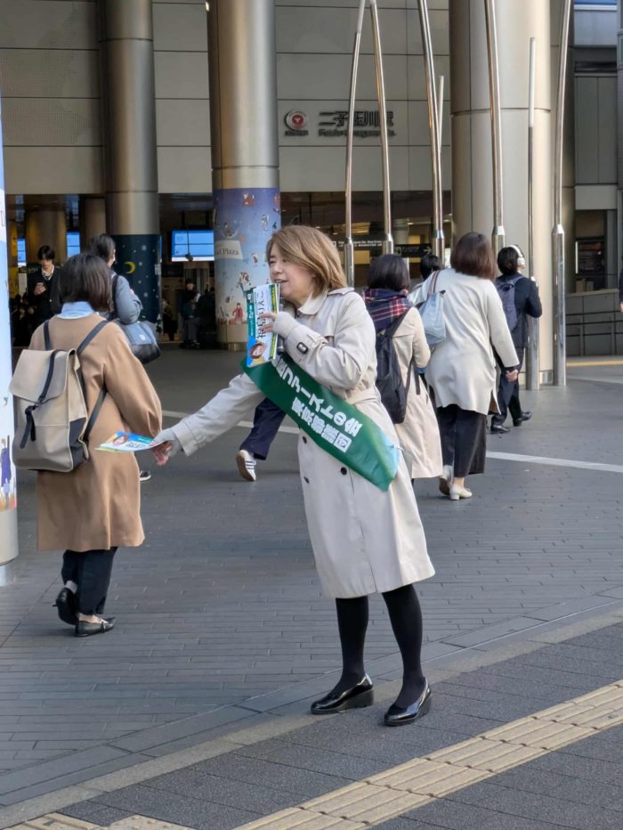 11/10の朝は、田園都市線二子玉川駅前にて、支援者お二人と一緒に、7:00-8:30でご挨拶するとともに、最新のレポート「リエコラボ通信40号」をお配りし、都議会第3回定例会の質疑の様子や、知事から「 「緑の広域計画」を新たに策定し、世界一、緑を実感できる都市を 目指していく。」との答弁があったことなどをご紹介しました。