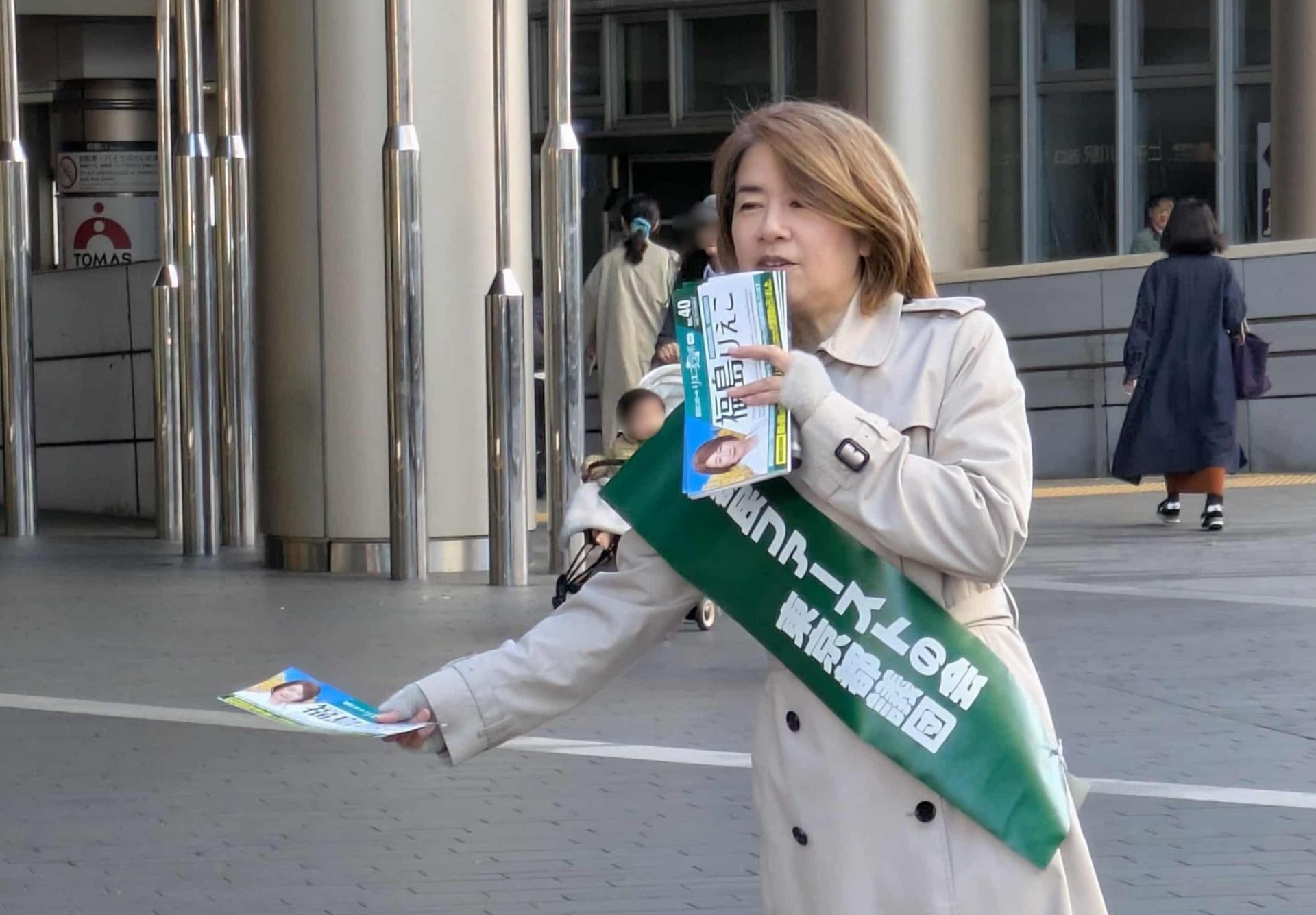 11/10の朝は、田園都市線二子玉川駅前にて、支援者お二人と一緒に、7:00-8:30でご挨拶するとともに、最新のレポート「リエコラボ通信40号」をお配りし、都議会第3回定例会の質疑の様子や、知事から「 「緑の広域計画」を新たに策定し、世界一、緑を実感できる都市を 目指していく。」との答弁があったことなどをご紹介しました。