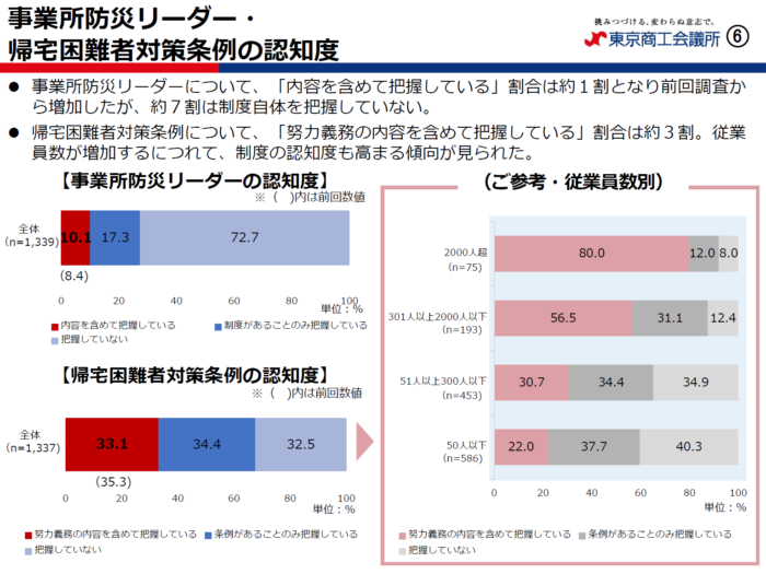一方、本年8月に発表された東京商工会議所が会員企業に行った、「災害・リスク対策に関するアンケート」では、事業所防災リーダーについて、内容を含めて把握している割合は約1割となり、前回調査から増加しているものの、約7割は制度自体を把握していません。