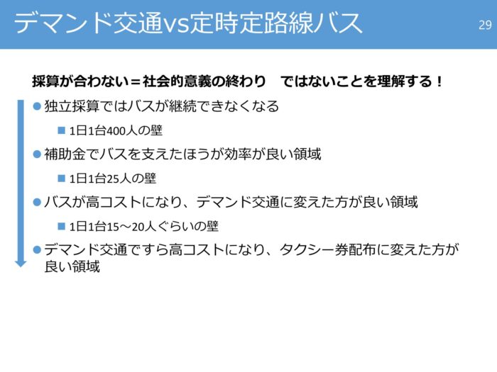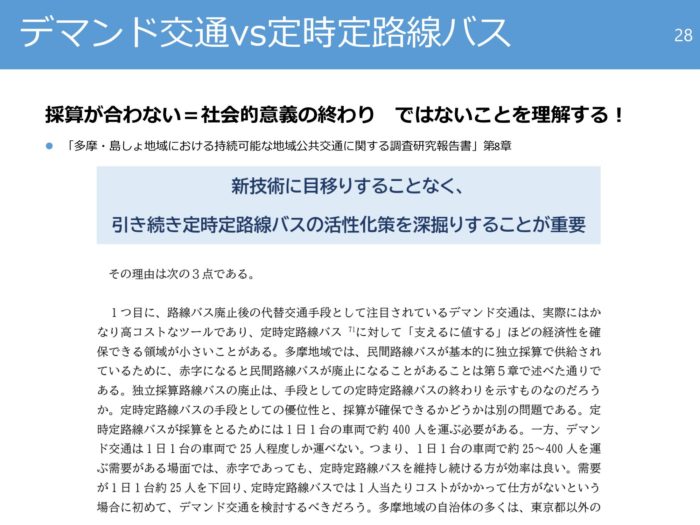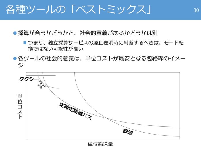 【補足】域内のみ、かつコミュニティバスやデマンド交通といった手法の限定は、検討の幅を狭めます。以下は、都民ファーストの会の公共交通PT(私が座長を務めています)で、「多摩・島しょ地域における持続可能な地域公共交通に関する調査研究報告書」を取りまとめた、計量計画研究所の何玏氏による勉強会の資料(一部)です。都民の移動手段として公共交通の持続可能性を高めるためには、一人の移動あたりの単位コストが最小となる交通手段を選択、維持するべきです。